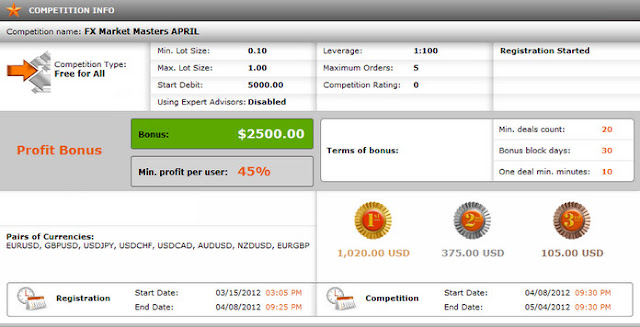 Kontes FXOpen Bulanan telah diadakan lagi. Pendaftaran sampai 8 April! Kontes ini akan diadakan antara tanggal 9 April dan 4 Mei 2012. Pemenangnya mendapat $ 1020 dan kesempatan untuk melanjutkan trading di account FXOpen ECN PAMM!